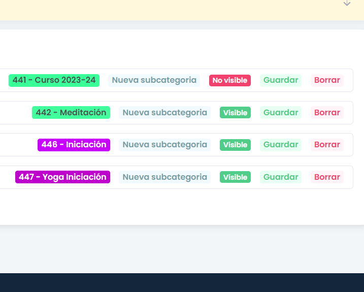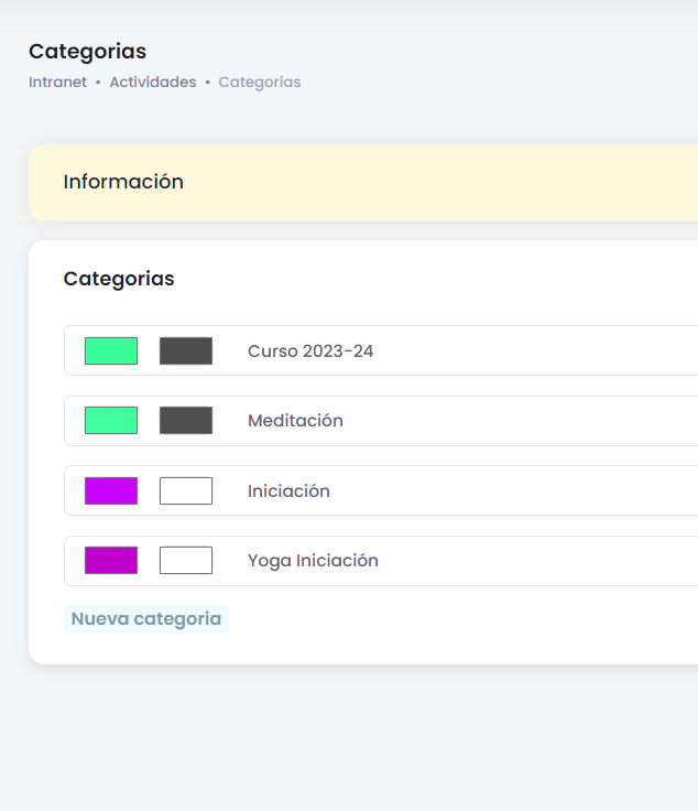 Es importante editar el color de las categorías para que en la visual actividades tengamos una lógica visual y saber que los cursos 2023/24 son en tono rojo y los del 2024/25 son en tonos azules.