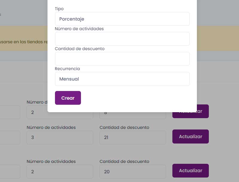 • Ofertas por número de actividades recurrentes en carrito. Premia a las personas que cursen más actividades en tu centro.